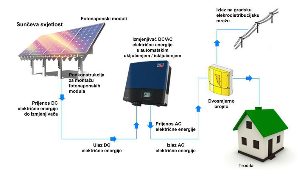 Generirana jednosmjerna struja iz solarnih panela zatim se invertira u upotrebljivu izmjeničnu struju kako bi se koristila u domaćinstvu ili se vraćala na elektroenergetsku mrežu.